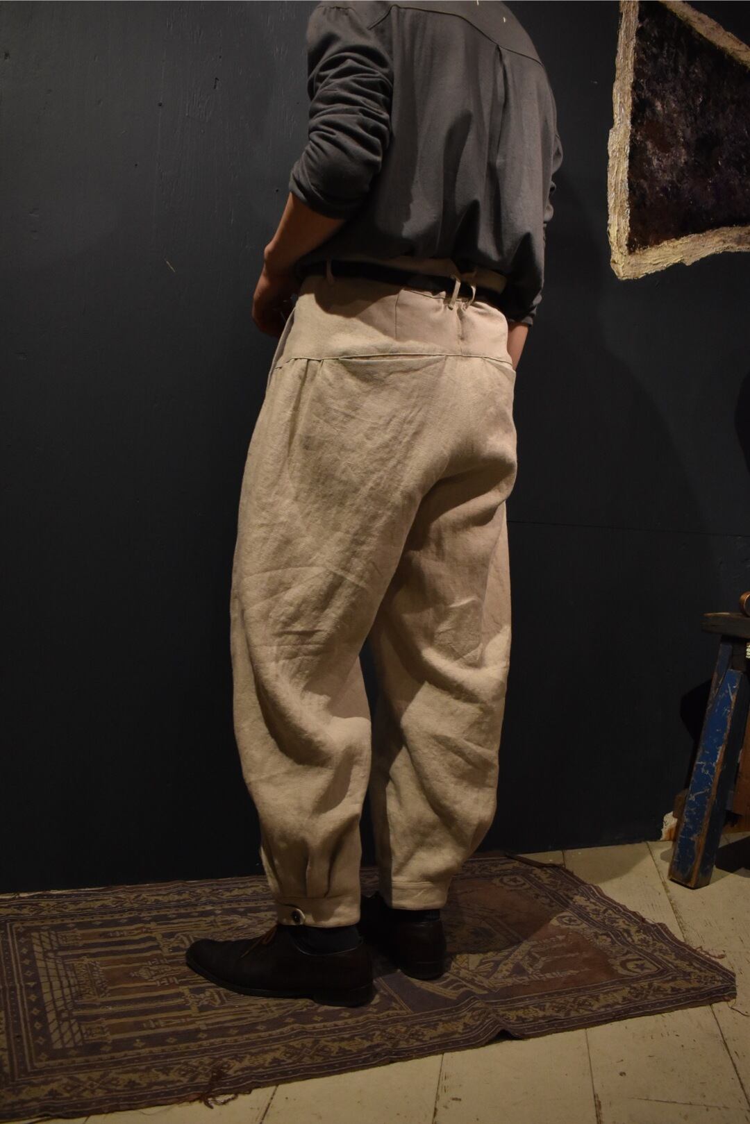 生成色のリネン100%のぷるっとした生地で仕立てられたバルーンパンツ。