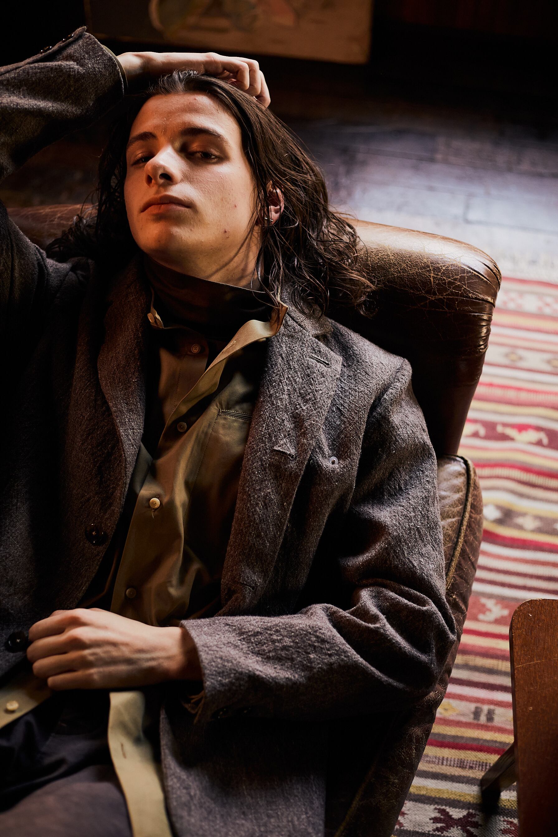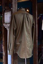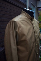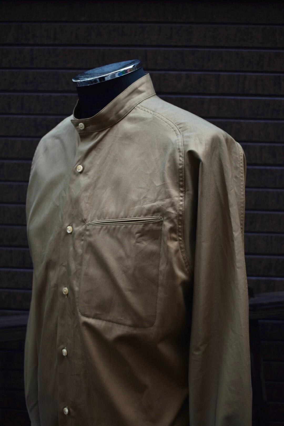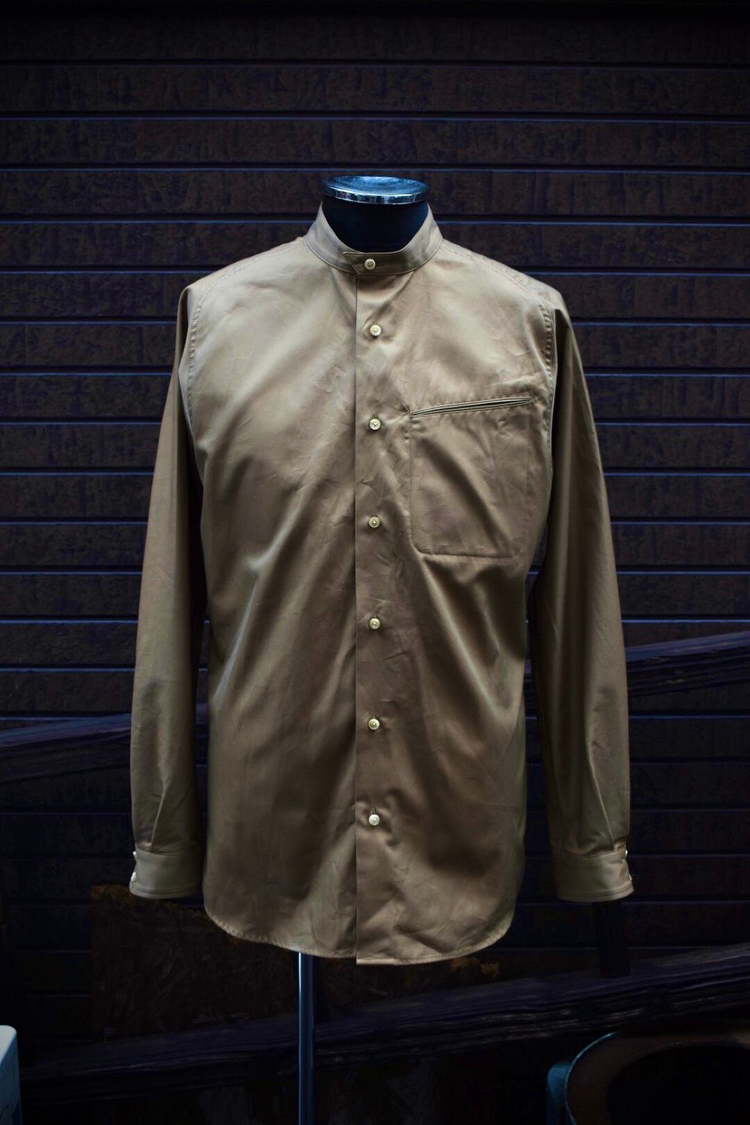 コットンギャバシャンブレーのfabricのスタンドカラーシャツ。